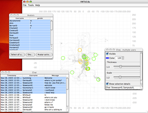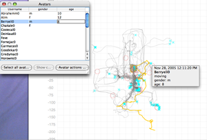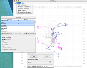 Here's an example where VWTk is very useful. After adding annotations, you can select subsets of avatars and change their visual attributes. Here males are set to blue and females to pink (thus enforcing the gender stereotype in the process ;). Then the animation tool is used to replay how the avatars moved through space allowing you to instantly examine differences in the way males and females moved in space. Rest of the symbols have been set to light grey to provide context and ensure that they don't interfere with the objects under study.