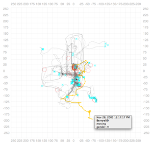 Hovering on symbols highlights them. In addition, all other symbols related to that entity are selected. For example, here lines are used to show trails of avatars (i.e. how they moved in the virtual world). Hovering over any part of the trail highlights the whole trail.